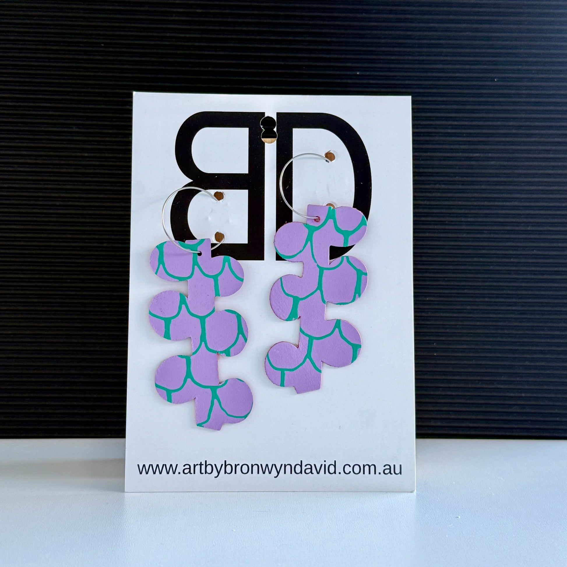 Materials include hand painted leather in a kelp cut shape on a stainless steel hoop.