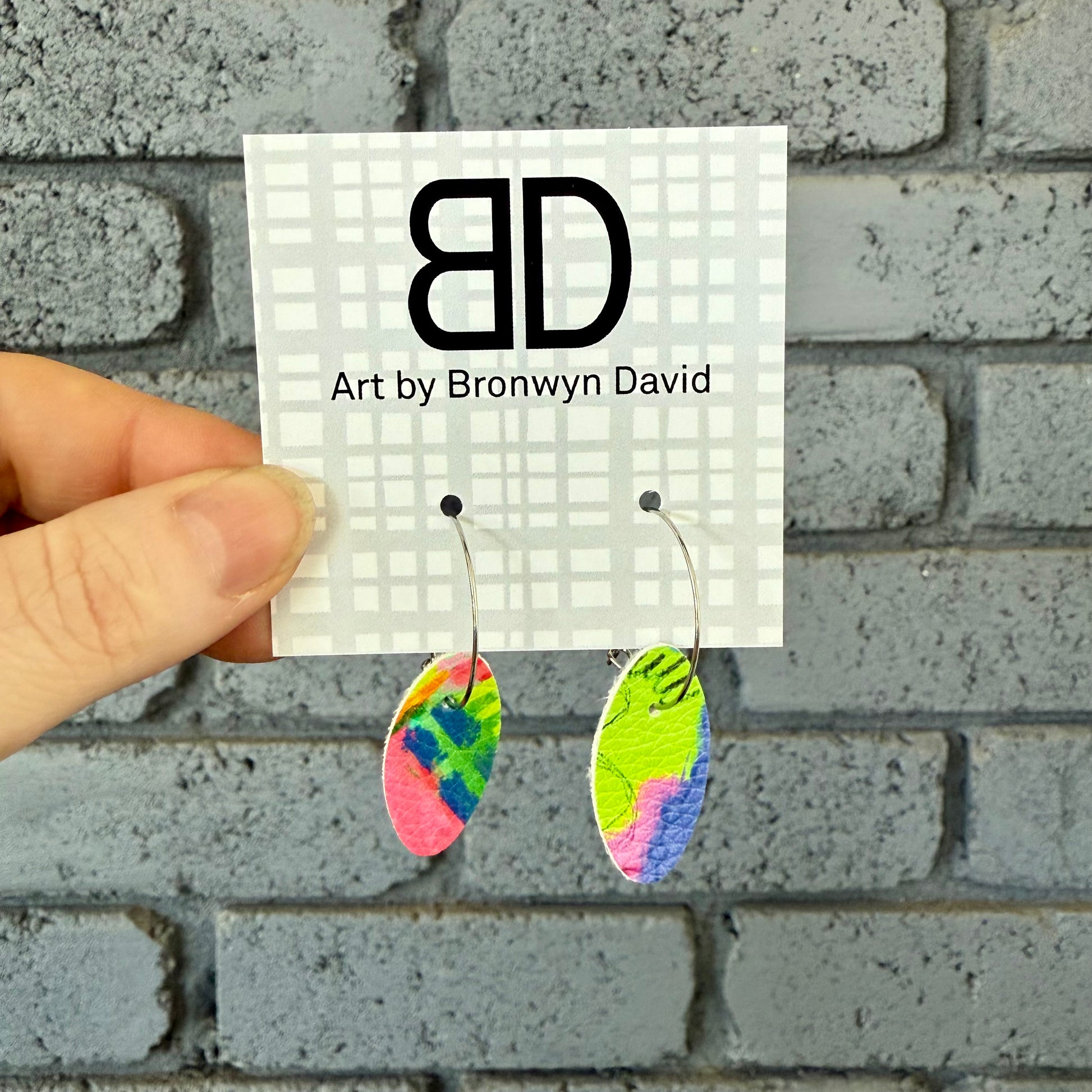 Materials include faux leather in various hand cut shapes on a stainless steel hoop.