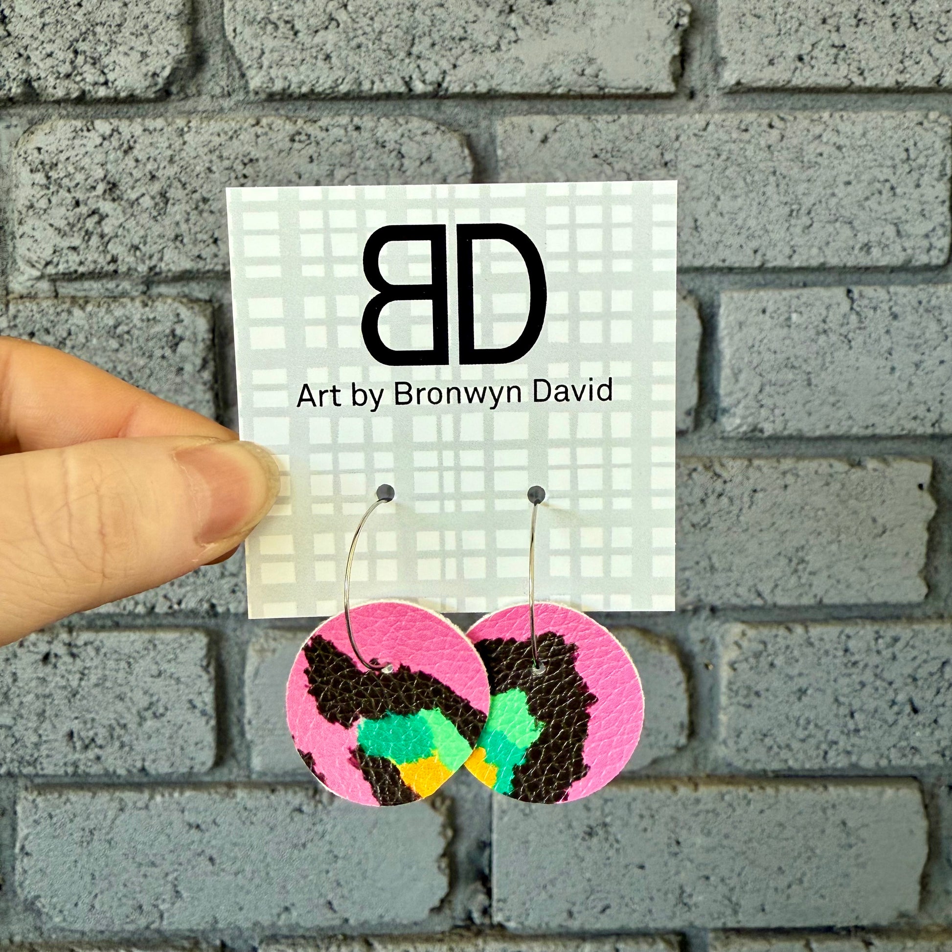 Materials include faux leather in various hand cut shapes on a stainless steel hoop.